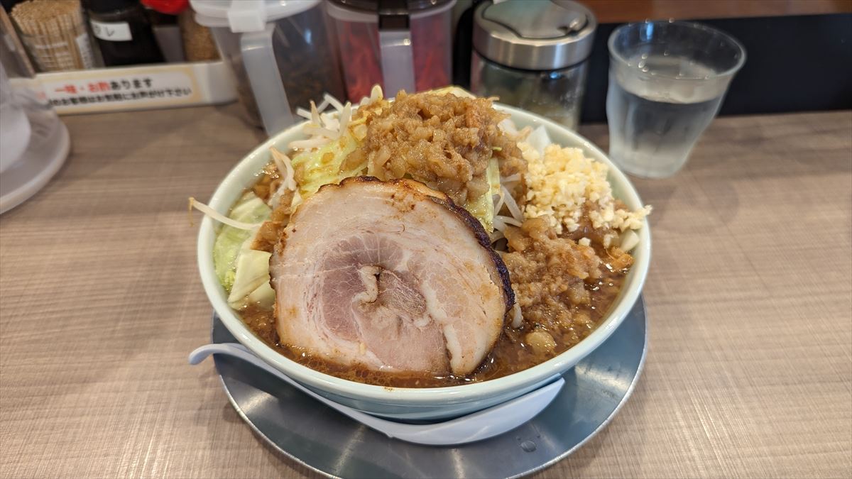 濃厚な駅とんスープに、たっぷりの野菜と背脂、極厚チャー