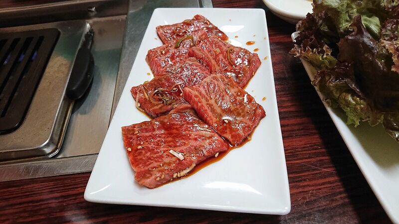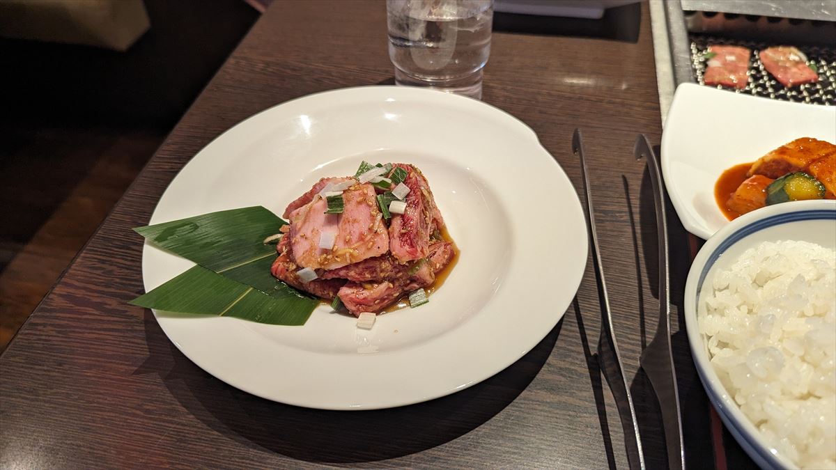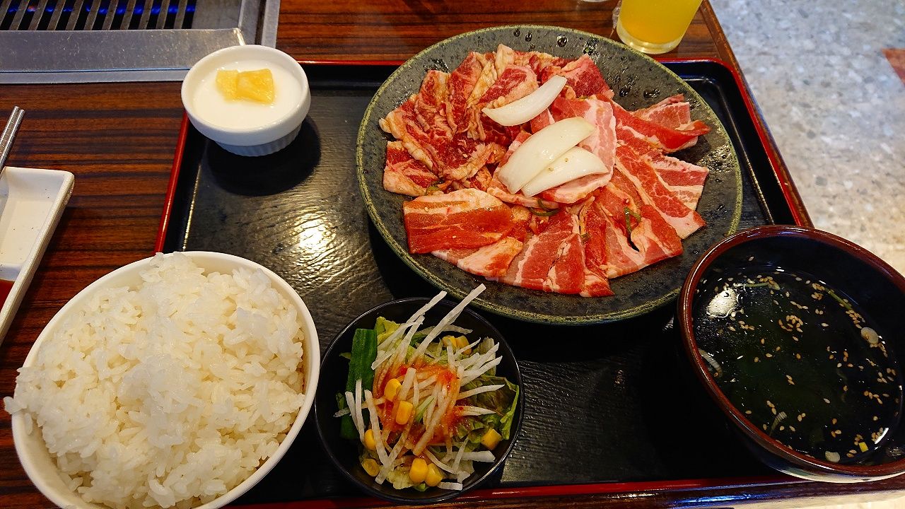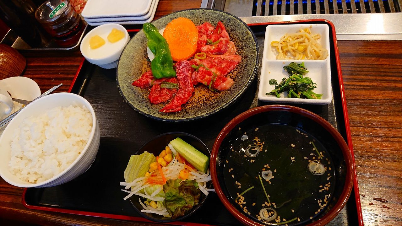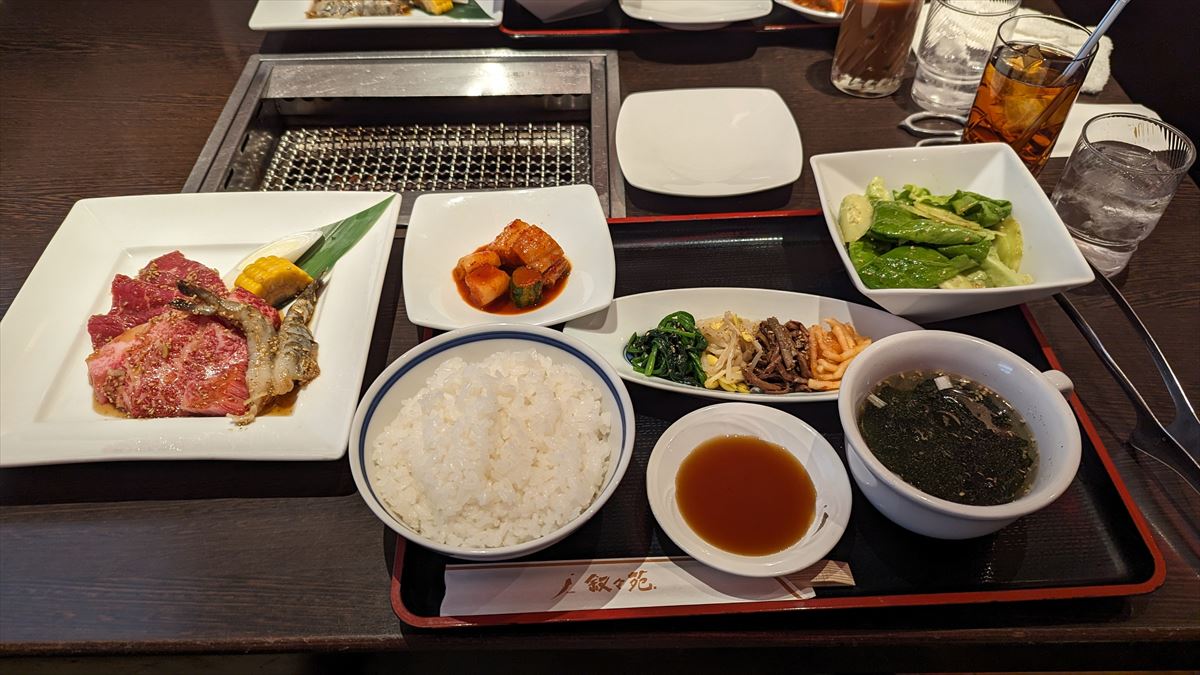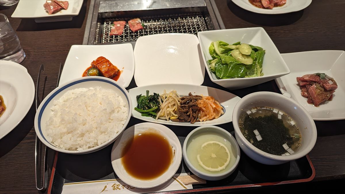 (牛切り落とし焼、漬物、サラダ、ナムル、ライス、スープ、デザート、ランチドリンク】